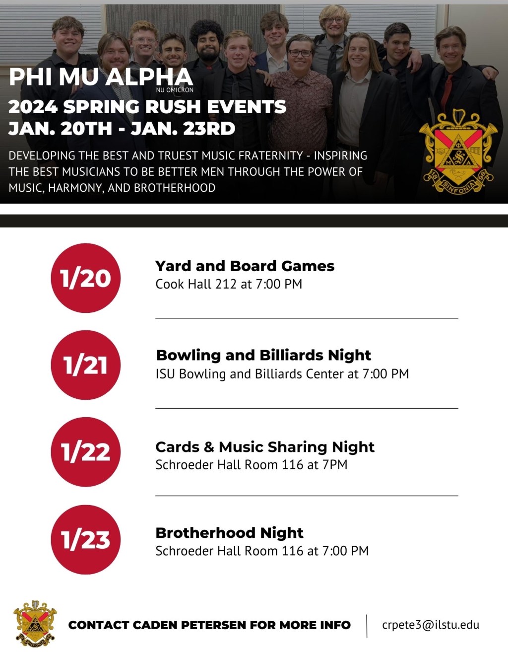 This year we are very excited to start with our rush process which goes from January 20th through the 23rd. This week gives the chance to talk to brothers and learn more about our Fraternity. We are excited to meet our next prospective member class this year! For any questions please reach out to Caden…